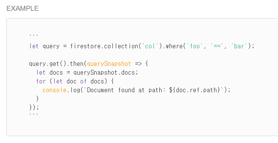 예를 들자면 이렇게 data() 메소드를 사용해서 우리가 쓸 수 있게 객체로 만들어준다. 여기서는 platnData가 스냅샷이다. 아래는 구글에서 제공하는 예시인데 보면 쿼리 스냅샷으로 나온다. 그것을 docs 메소드를 통해서 순회하고 있다. 스냅샷 상태에서 다양한 메소드를 사용할 수 있는데 이게 유용할 때도 있고 굳이 한 단계를 거쳐 데이터를 사용하기 때문에 불편할 때도 있다. 예를 들어 empty 나 size로 데이터가 존재하는지 알 수 있거나 문서 수를 size로 알 수 있어서 좋은데 그냥 data 쓸 때는 굳이 메소드를 써서 한 번 더 거쳐야한다.