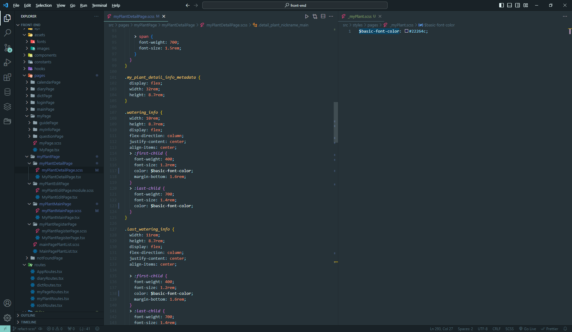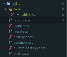 스타일 파일을 이렇게 구성했는데 scss를 전체를 바꿔주기엔 너무 범위가 커지는 것 같아 내가 담당한 페이지에 한해서 공통 속성에 대해 변수로 처리하기로 하였다. 만약 바꿔줄 수 있다면 공통으로 처리할 수 있는 것들은 변수로 미리 처리한 다음 각 페이지에서 사용하는 것이 좋다고 생각했다. 지금은 폰트하나를 변수 처리하더라도 일일히 페이지를 다 확인하기에 그건 조금 무리인 듯 싶었다. 일단 base대신 pages로 폴더링 후 폰트 색깔부터 처리해보려한다.