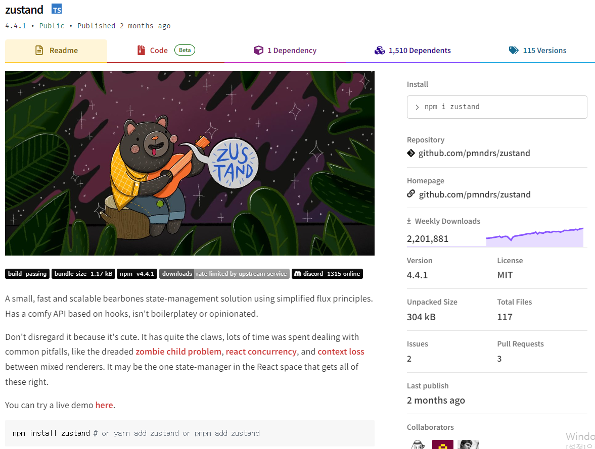 참고로 Zustand는 독일어로 상태를 뜻한다. 나는 이상하게 별개 다 궁금하다. 그리고 barebone이라는 단어가 최소한이라는 뜻인데 여기 캐릭이 곰이라 bearbones라고 써있다. 말그대로 최소한의 설정으로 상태 관리를 해준다는 의미이다.