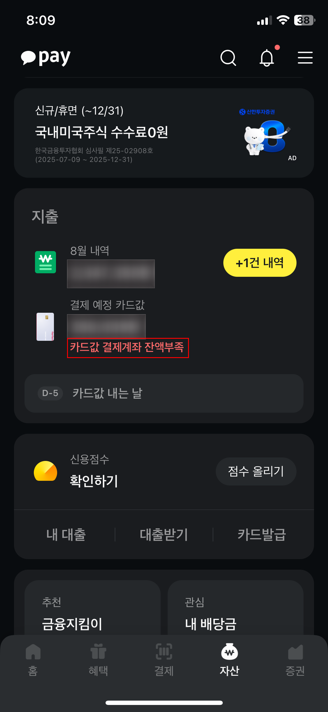 그리고 마지막으로 내가 정말 잘 만들었다고 생각한 기능은 카드 대금 지불 관련 기능이다. 아래 이미지를 보면 예정 카드값이 있고 통장 잔고에 카드값 낼 돈이 있는지 없는지 알려준다.