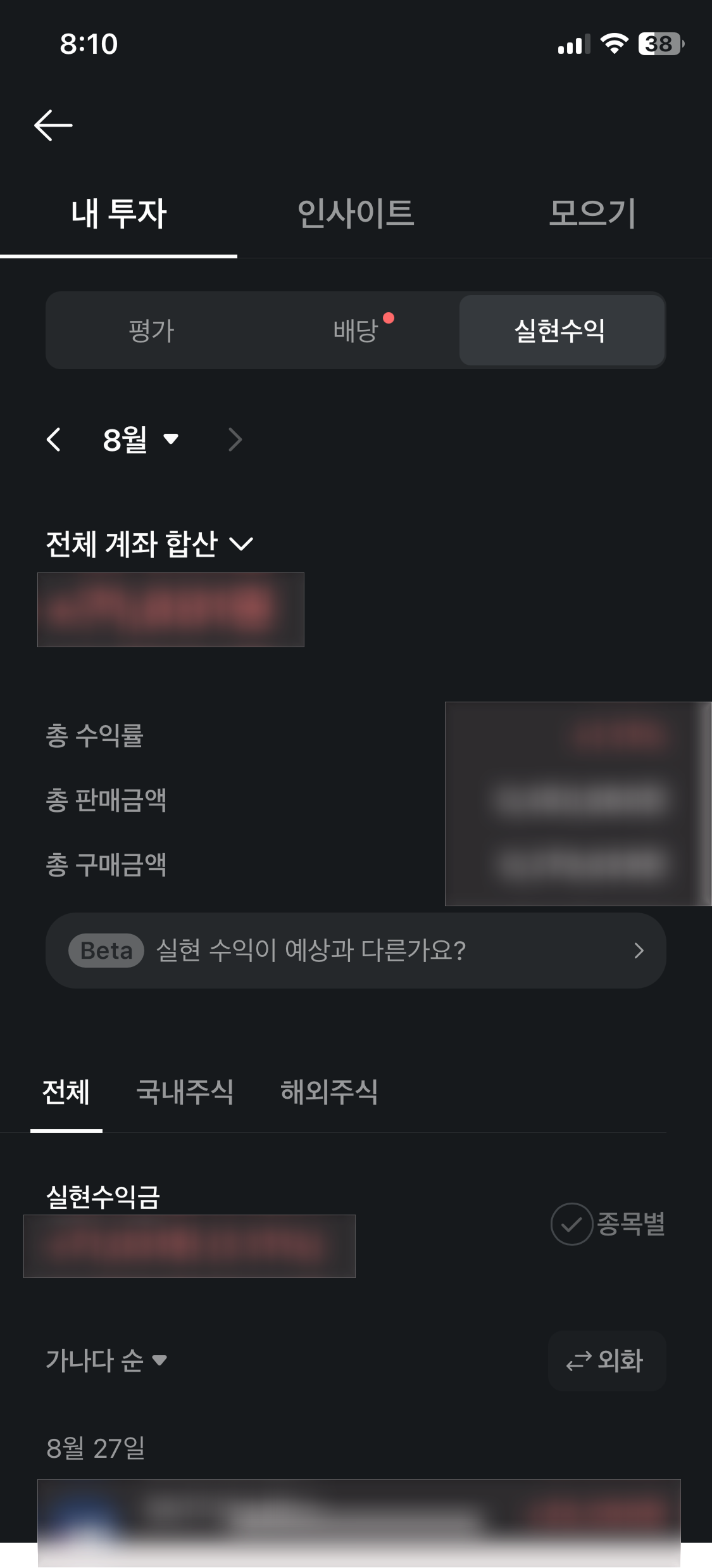 국내/해외 주식으로 필터되어 볼 수도 있고 아주 만족스러운 기능이지만 다만 판매 데이터가 모두 노출되지 않아 아쉬움이 남는다. 내가 8월 초에 피그마 상장 시 좀 손해를 보고 판 것이 있는데 짧은 기간에 사고 팔고 해서 그런지 판매 기록이 남지 않았다. 데이터가 거짓말 하지 않으므로 이 부분에서 실현 손익 데이터 제공 기능이 아직까지 구현이 안되었던 이유가 되었을지도 모른다. 더불어, 배당 정보도 보여주고 있다.