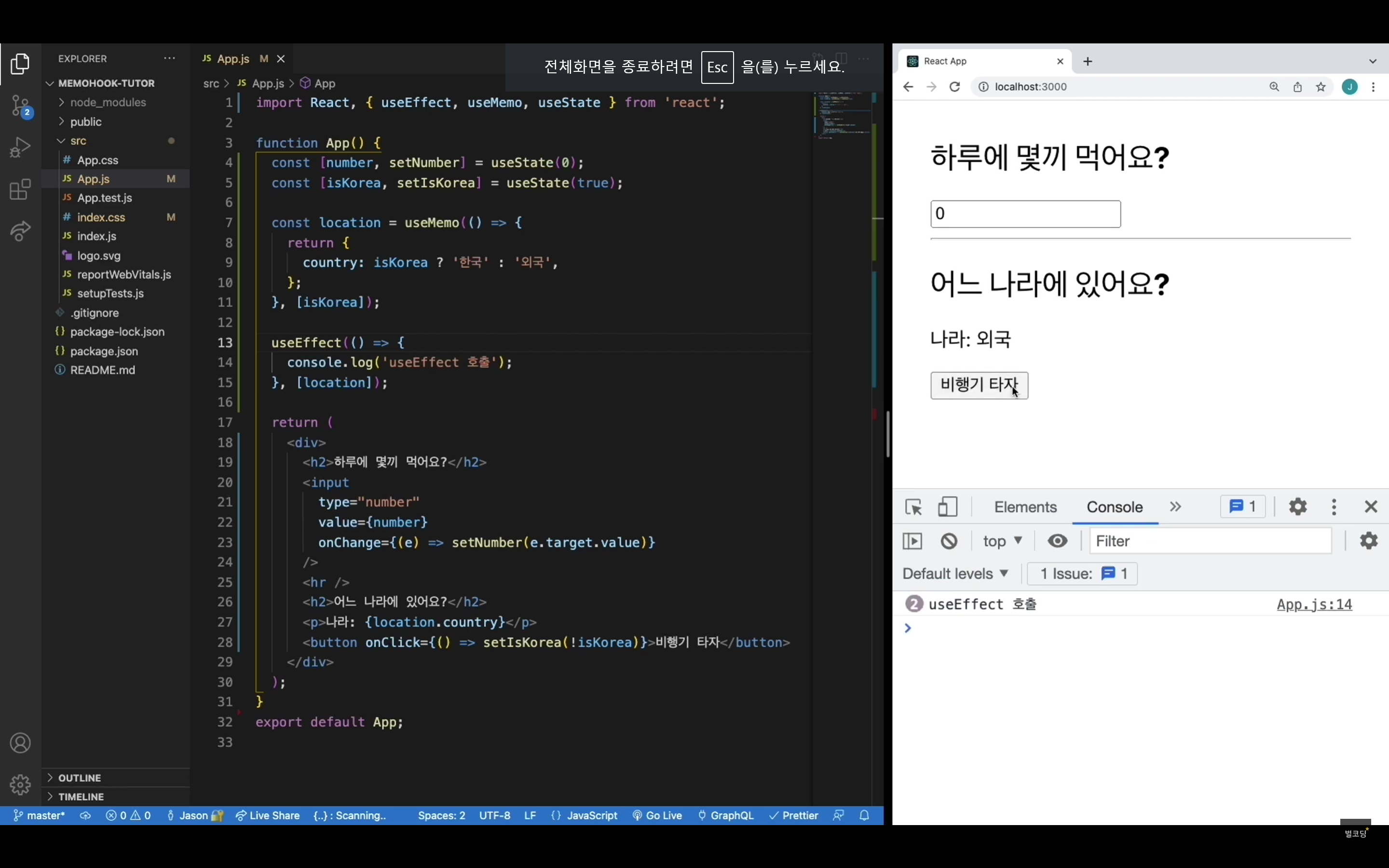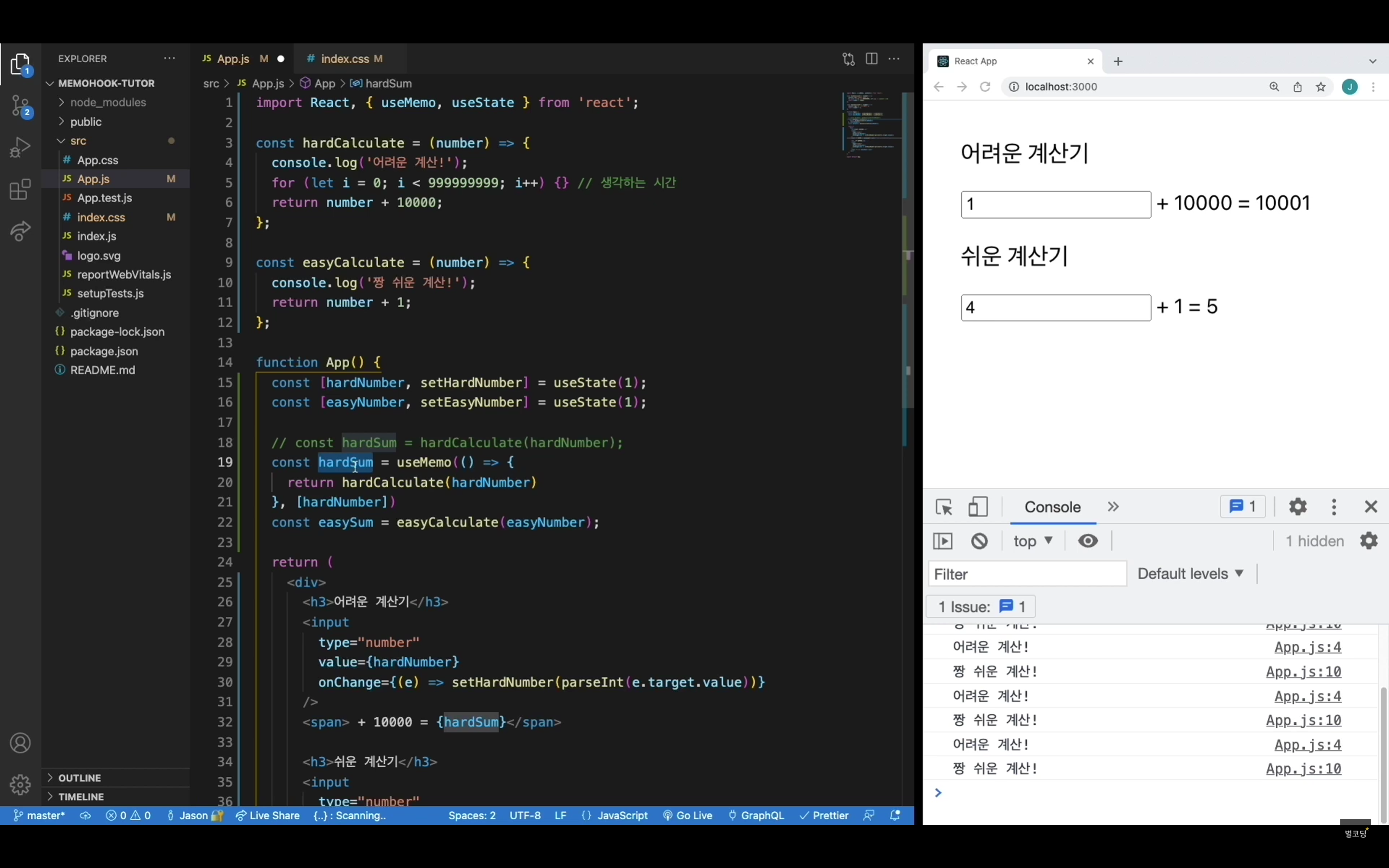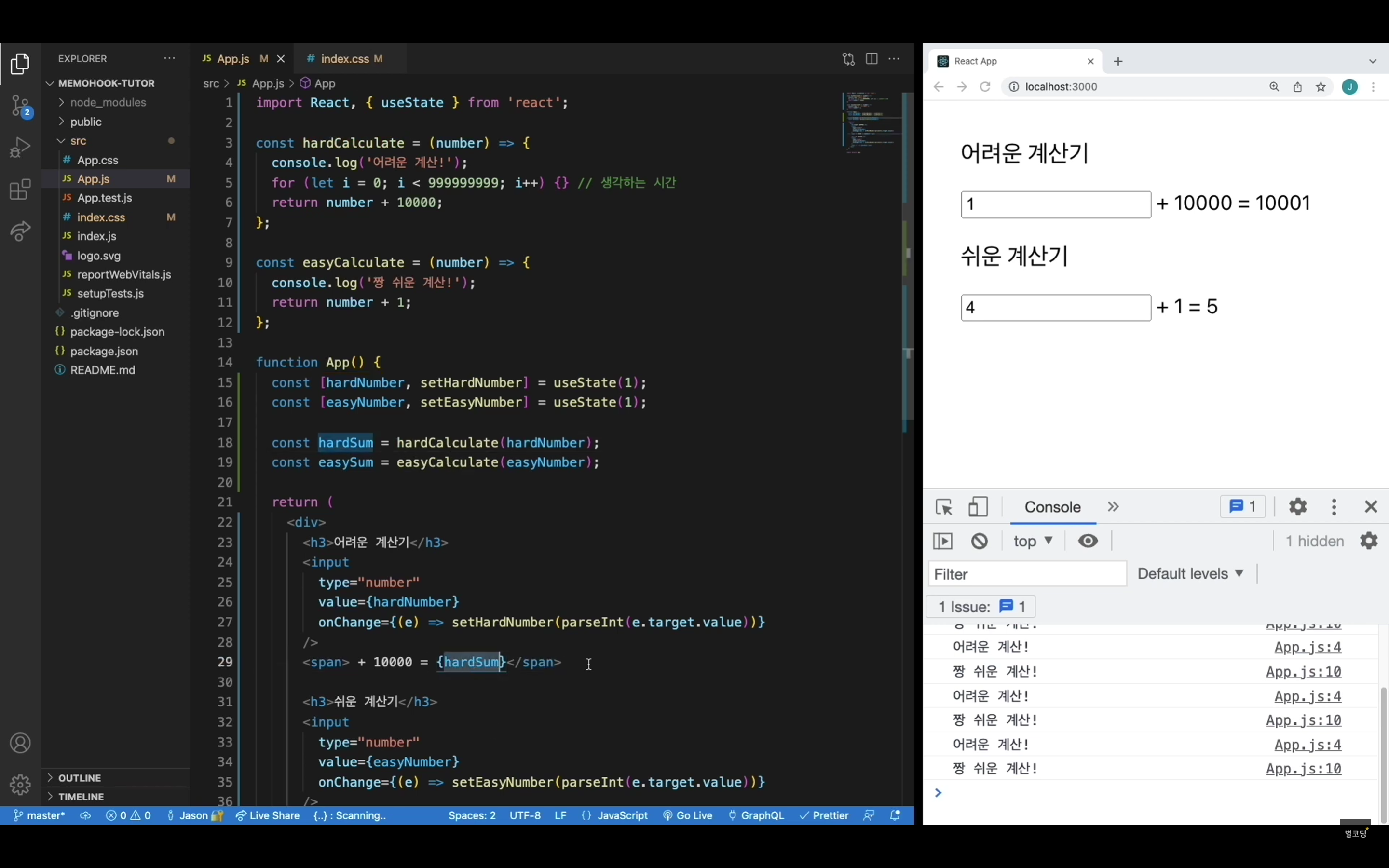 리액트는 기본적으로 상태가 변하면 렌더링을 다시한다. 아래 코드에서보면 하드 넘버와 이지넘버가 상태로 지정되어 있는데 각 input의 값이 변하면 상태가 변하므로 app함수는 새로 호출될 것이다. 근데 생각해보면 하드넘버가 변하는데 easyCalculate 함수가 호출되는 것은 매우 비효율일 것이다. 반대도 마찬가지이다. 그래서 이지넘버, 하드넘버를 기억시켜 새로 함수가 호출되는 것을 막는다.