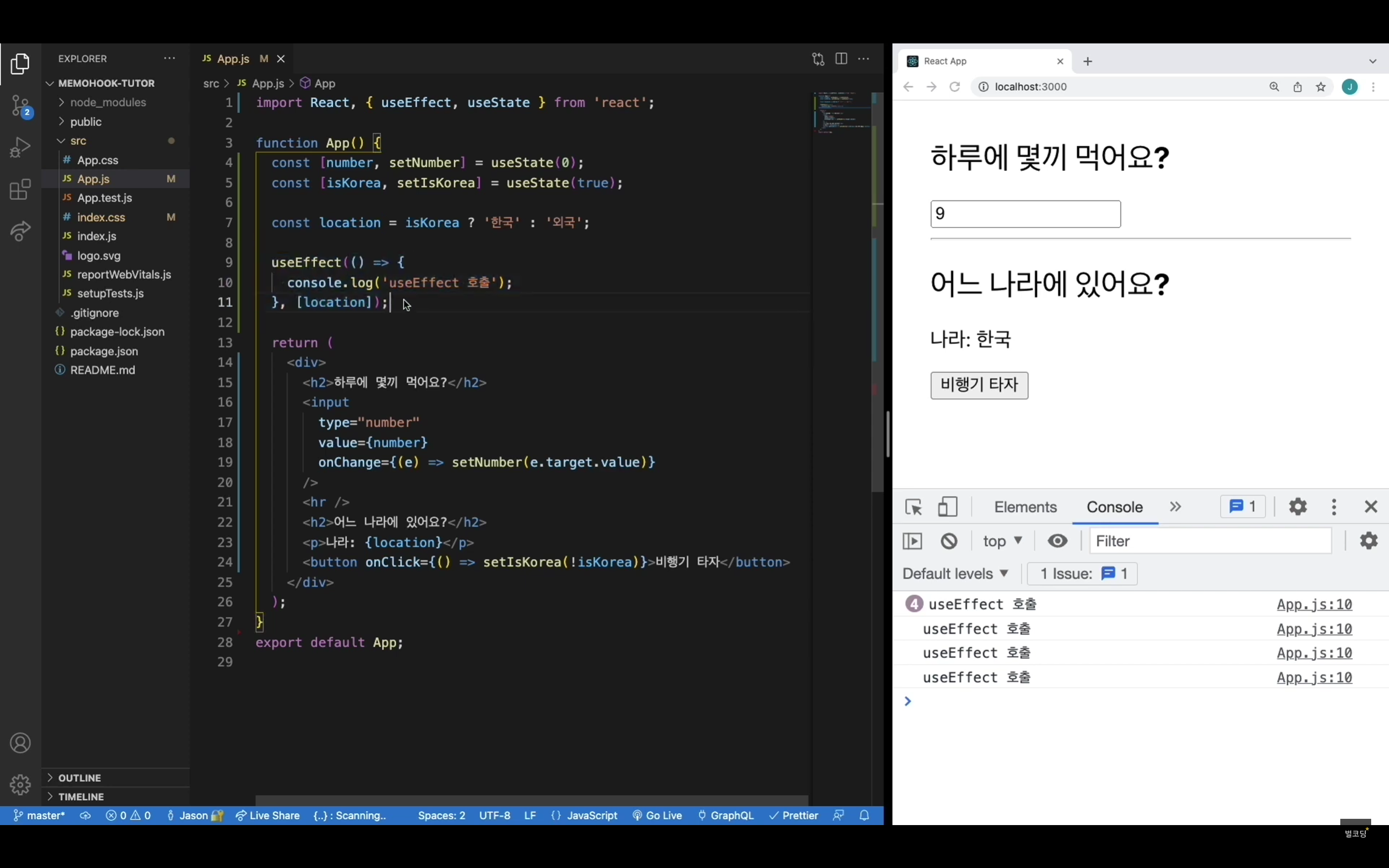 다음 예시도 사실 비슷한데, location이 원시 타입이냐 객체 타입이냐 차이가 더 크다고 볼수 있다. 원시 타입은 메모리에 참조값이 저장되기 때문에 유즈이팩트의 의존성 배열에 location을 넣어도 useEffect가 재호출된다. 그래서 이런 경우에는