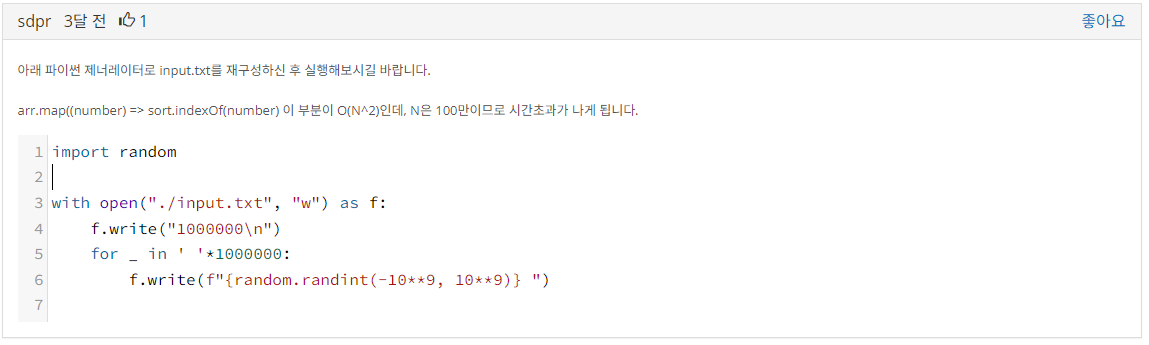 코드도 짧아서 성공이다 싶었지만 시간초과로 계속 실패였다. 문제는 내가 시간 복잡도에 대한 개념이 없다보니 발생한 문제였다. 순회하면서 인덱스 값을 찾는게 복잡도를 상승시킨다는 글을 보았다. 다음은 문제 대신 이 부분을 공부해야겠다.